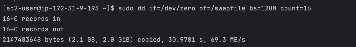 사용하고 있는 t2.micro의 크기는 1GB이기 때문에 스왑파일의 크기가 2GB가 될 수 있도록 bs=128M count=16으로 설정하였다.