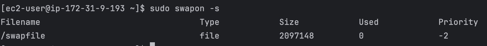 현재 활성화된 스왑공간을 확인할 수 있다. 의도한 대로 2GB의 스왑공간이 활성화 중이다.