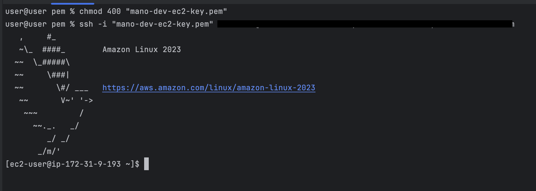ssh -i ~ 로 시작하는 명령어를 복사하여 pem 파일이 있는 위치에서 실행한다.